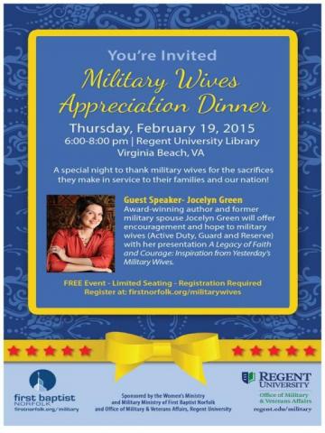 Regent University and First Baptist Norfolk Church are offering a free Military Wives Appreciation Dinner on Thursday, February 19, with award-winning author Jocelyn Green as the speaker. Her topic will be: A Legacy of Faith and Courage: Inspiration from Yesterday’s Military Wives.